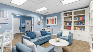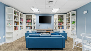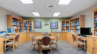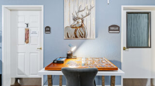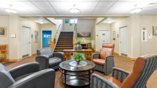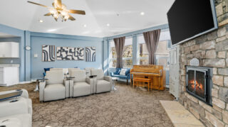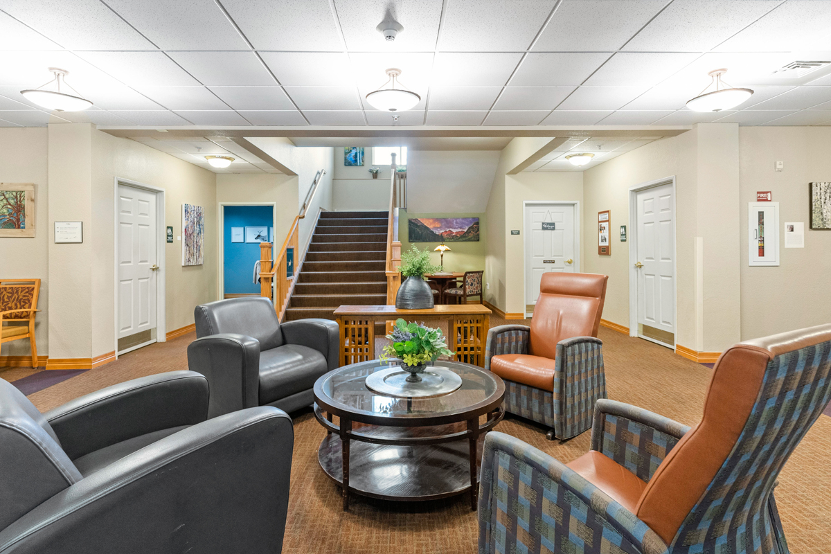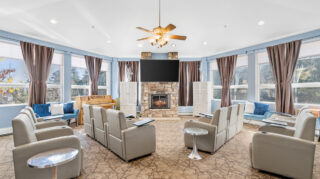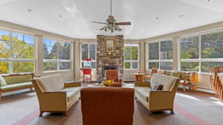 Inside, Elk Run features a warm mountain rustic style that harmonizes with its natural surroundings. Natural stone and wood lend to a cozy atmosphere. Lounges provide areas for relaxation and socialization. Residents can enjoy delicious meals together and participate in a full calendar of clubs, classes, and events. A salon is available for personal care, and exercise classes are offered to promote wellness.